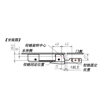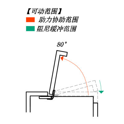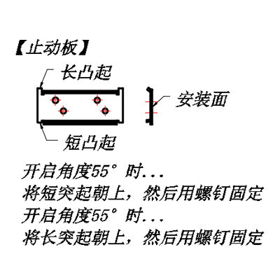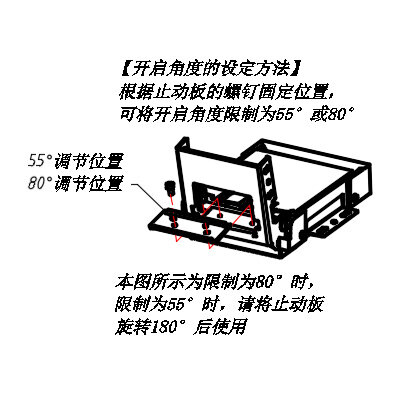 | 安装时,应确保各较链的轴心之问无编差,若在开启方向用力过大,产品上会作用负载,应另行设置止动益 |